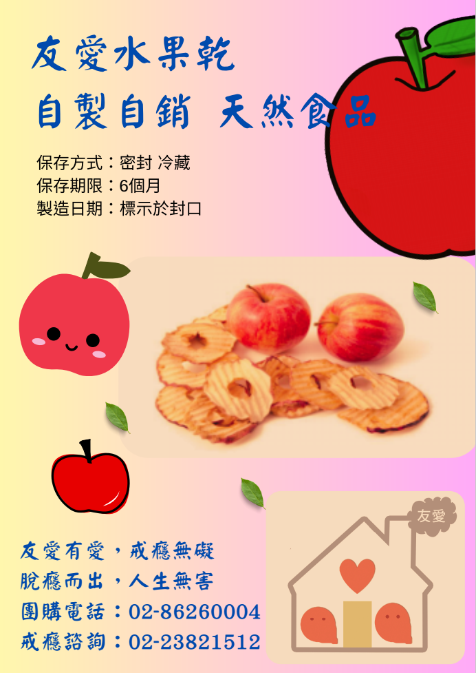 友愛天然蘋果乾(無加糖) 由本會學員自製自銷之天然果乾食品,以低溫烘烤方式製作,完全無添加糖,健康零負擔, 保留蘋果原始的香氣和營養。 果乾製作過程及環境乾淨衛生,食品無任何化學添加物、糖及油類,低溫烘烤後包裝完成。 內容物:蘋果 保存期限/最佳賞味期:常溫六個月。(開封後務必冷藏並盡快食用完畢。) 敬請支持本會學員自製自銷之果乾產品,給她們自立更生的能力,以及重返社會的機會! 謝謝您的支持與愛心! 本產品每包售價200元,運費60元。 訂購5包(含)以上免運費。 果乾製作需要時間,歡迎提前來電訂購:02-86260004